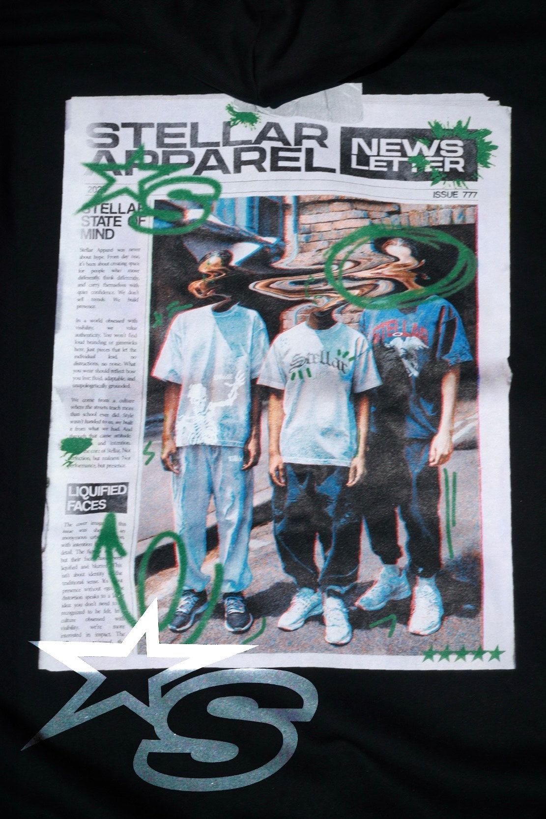 The Stellar Apparel Newsletter Zip Up Hoodie brings together style and comfort with a bold graphic design and clean details. Made from 100% cotton, this unisex hoodie features a full zip closure, front pockets, and our signature newspaper-inspired artwork on the back with a refined logo on the front. Offered in black and flower gray, it’s a versatile piece designed to stand out while staying easy to wear every day.
